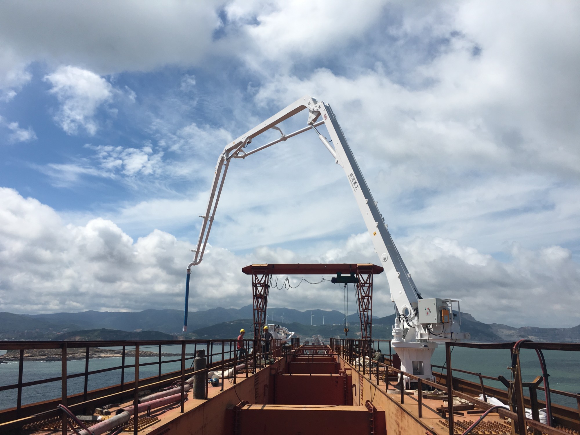 21米船上混凝土液壓布料機配置方案采用一體式進行混凝土泵送,把布料機安裝在船的甲板上固定,船艙內放置攪拌罐、拖泵進行鏈接一條流水式泵送系統,可以把混凝土運輸到施工復雜以及跨海大橋橋墩位置進行澆筑。